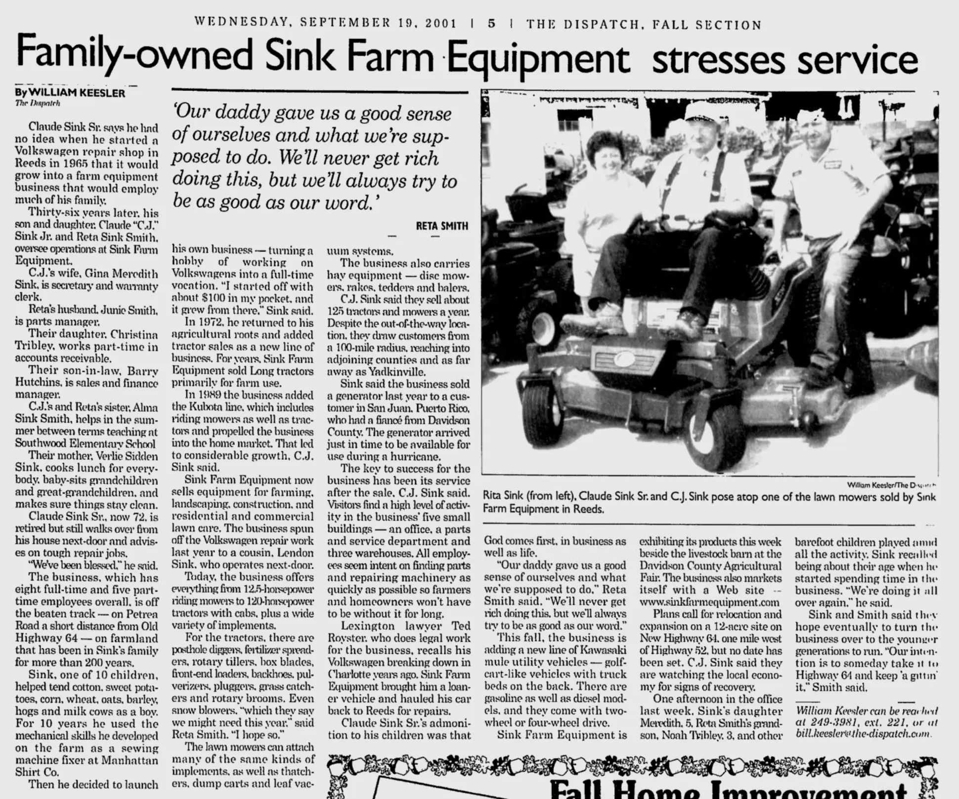 Sink Farm Equipment, founded in 1965 by Claude Sink, Sr., began as Sink's Garage, a Volkswagen Repair shop in the backyard of his home.